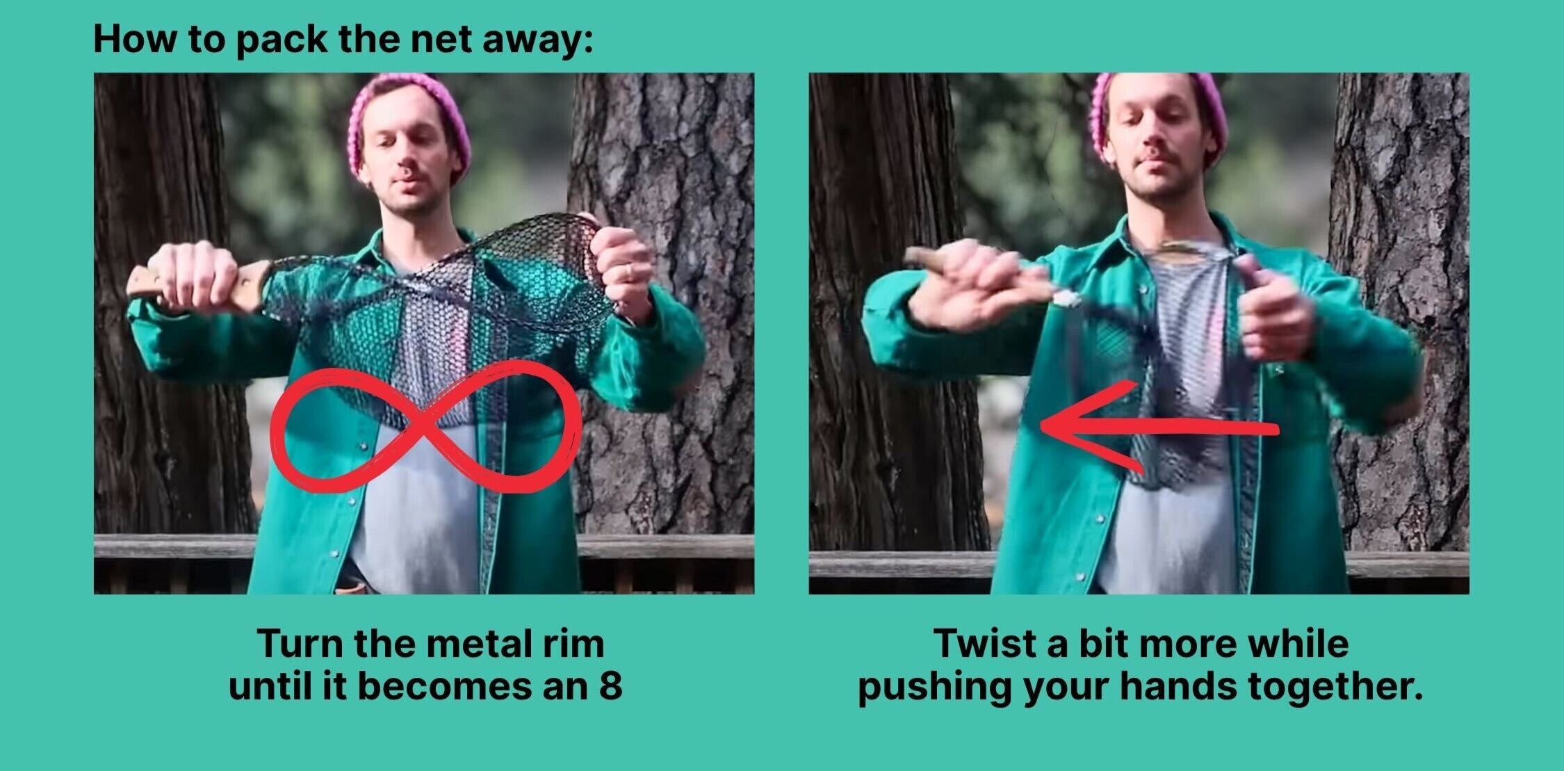 Turn the rim into an “8”, twist, and press together — your Insta Net is ready to stow.